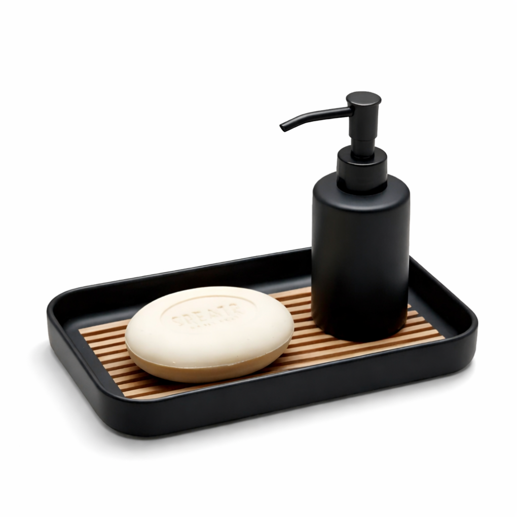 O estrado com estética de madeira mantém o sabonete seco, prolongando sua durabilidade e deixando a pia sempre limpa.